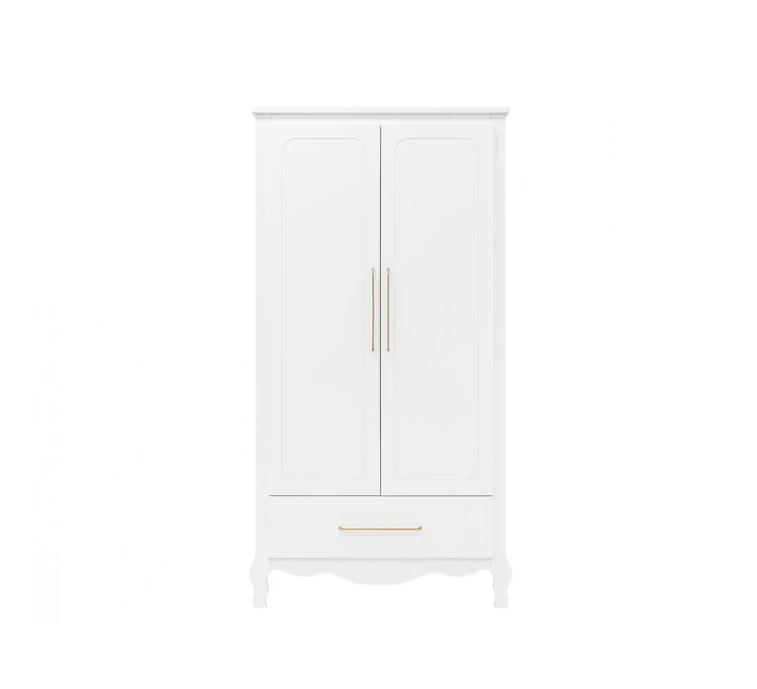 Deze ruime 2-deurskast XL Elena van het merk Bopita is niet alleen een schitterend meubel voor in de babykamer, maar biedt ook nog ontzettend veel opbergruimte. De kast is voorzien van een lade aan de onderzijde. Achter de twee grote deuren gaat veel ruimte schuil. De kast wordt geleverd met een vaste legplank, een hangroede en een in hoogte verstelbare legplank. De deuren en lade zijn voorzien van ranke, matte, goudkleurige handgrepen. Dit is kenmerkend voor de serie Elena. De deuren zijn bovendien voorzien van subtiele groeven voor een extra chique effect.