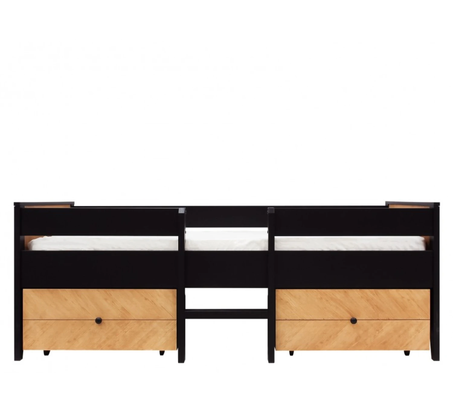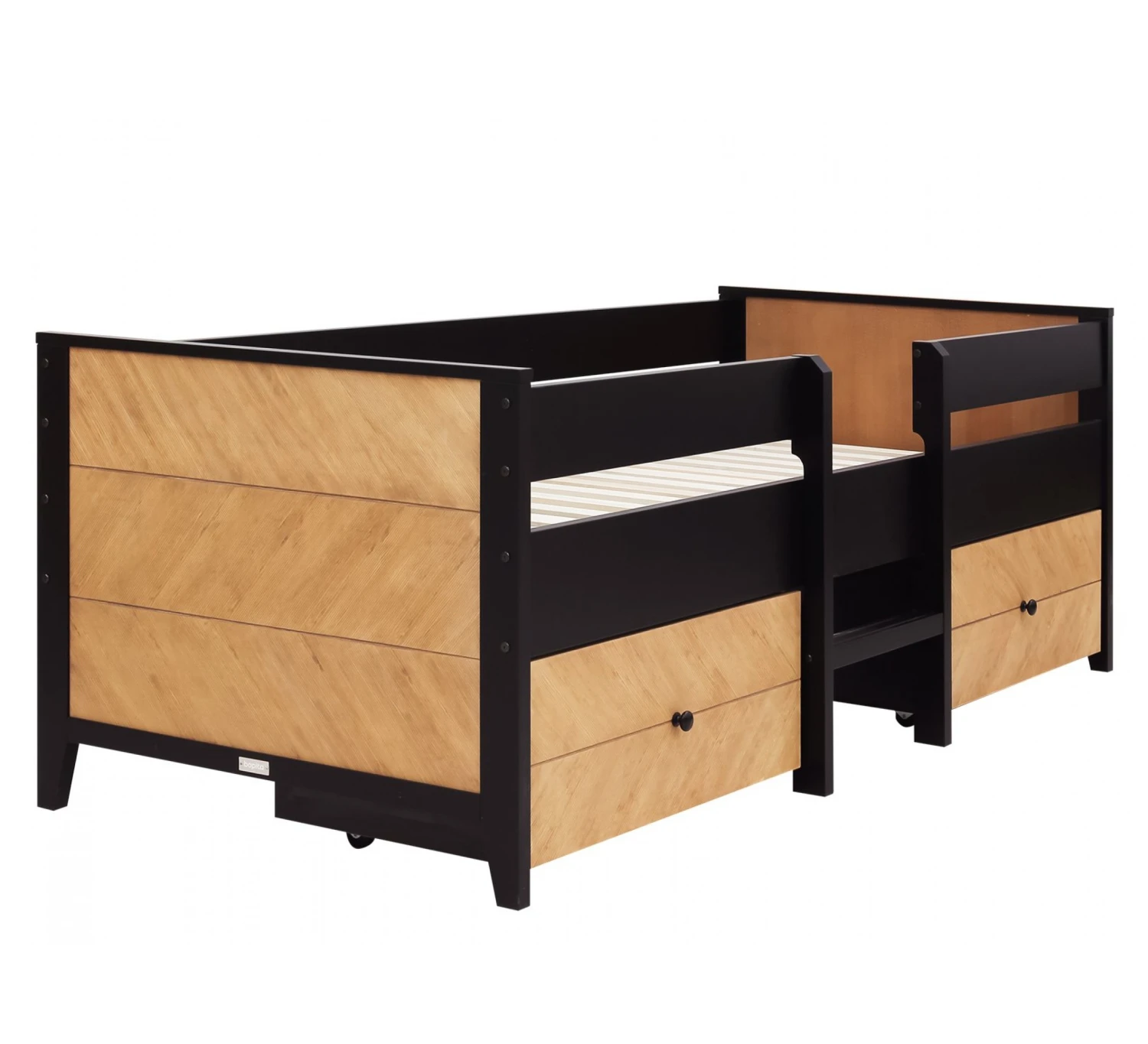Het compactbed Job van Bopita is uitgevoerd in een stoere combinate van mat zwart en gefineerd hout. Dit stoere hoge bed wordt geleverd met twee ruime laden voor speelgoed. Bij dit bed krijg je dus heel veel opbergruimte! Het trapje in het midden van het bed zorgt er voor dat jouw kindje eenvoudig in en uit kan stappen. Het hoofd- en voeteneind zijn voorzien van een hout fineer in visgraatmotief. Dit 90x200cm compactbed wordt geleverd inclusief uitvalbeschermers, lattenbodem, 2 opberglades en trapje. Aangezien het een natuurproduct betreft kan de houtstructuur per meubel van de serie Job verschillen.
