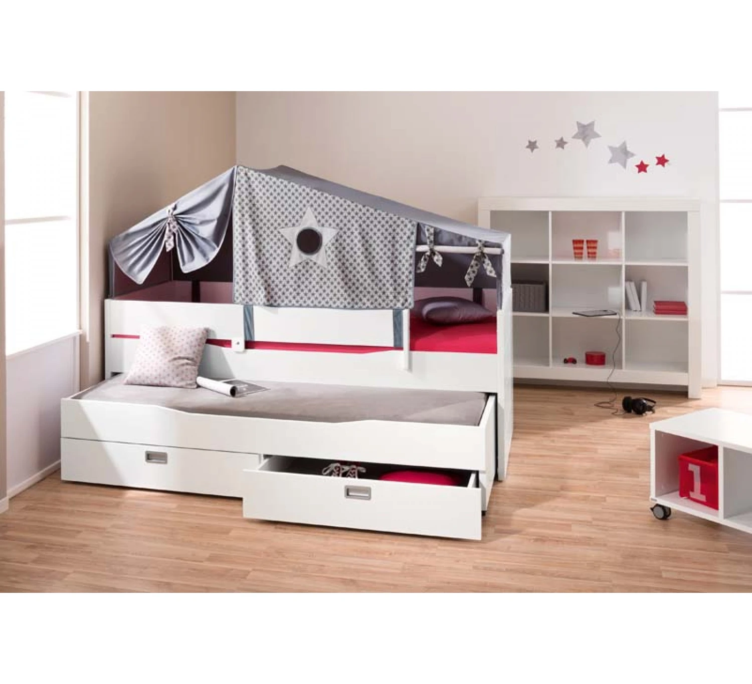 Het onderschuifbed past perfect onder het Fiona kajuitbed. Het kajuitbed is makkelijk tevoorschijn te halen door de 2 rollers. Onder het slaapgedeelte zitten nog twee grote lades waar veel speelgoed of kleding in past. Het onderschuifbed is verkrijgbaar met mat chromen of glanzend chromen handgrepen. Het matras en de lattenbodem zijn los verkrijgbaar voor het onderschuifbed. Afmetingen: Lengte: 198 cm Breedte: 95 cm Hoogte: 40 cm