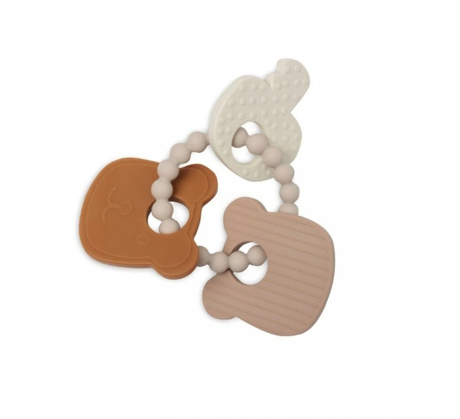 Deze siliconen bijtring met neutrale kleuren is een perfect speeltje voor kleintjes die graag dingen in hun mond doen.