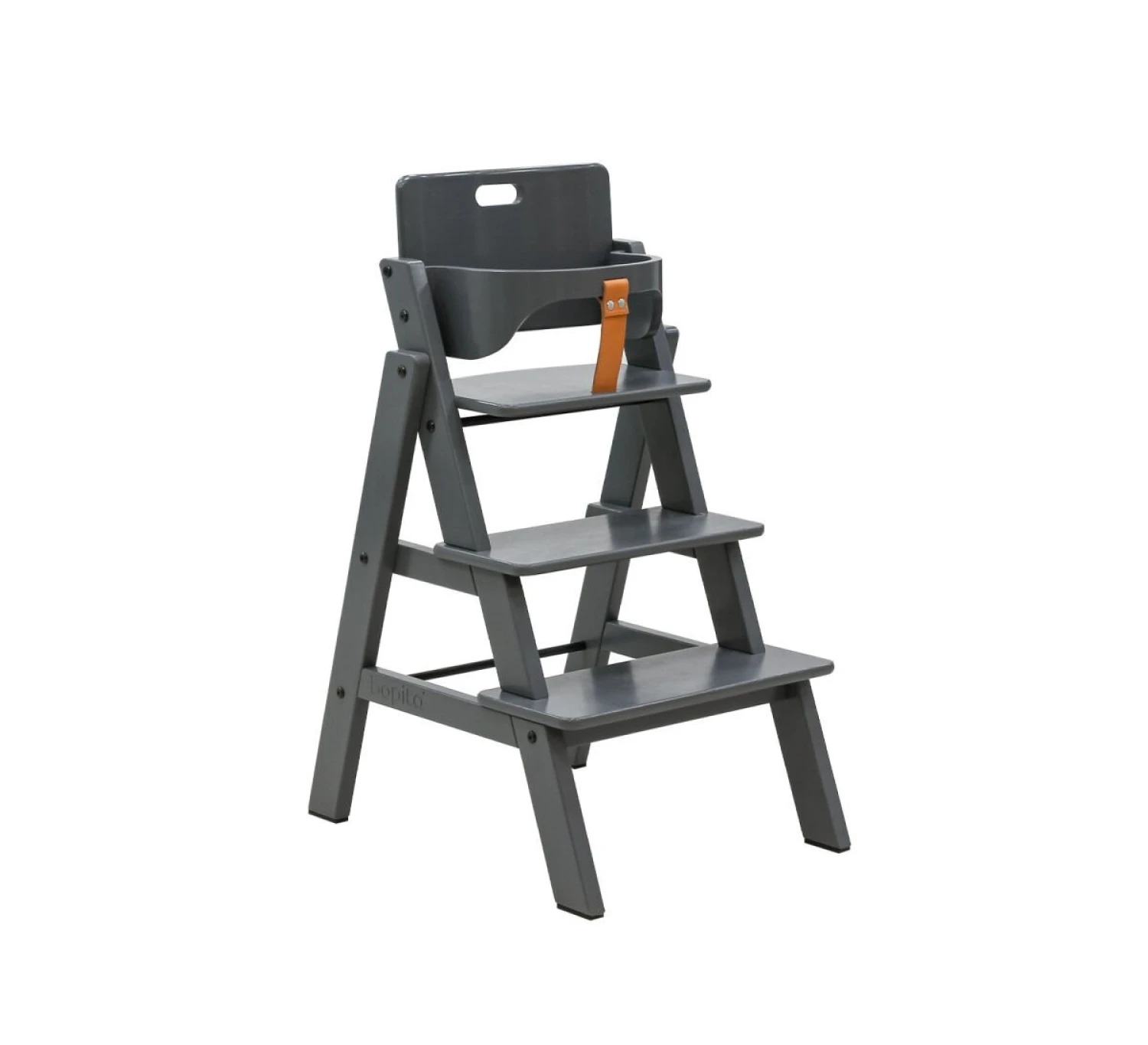 Bopita kinderstoel Stully is dé stoel waar het kind gemakkelijk zelf in en uit kan stappen. Door de twee treden is het instappen kinderlijk eenvoudig. U kunt de stoel vanaf 6 maanden gebruiken mét beugel. De beugel zorgt voor een veilige zitplek. Vanaf 36 maanden kan de beugel verwijderd worden en kan het kind zelf leren om in en uit de stoel te klimmen met behulp van de 2 staptreden. De beugel wordt met een stoere, bruin lederen band bevestigd aan het zitvlak. Eventueel kan vanaf het begin een Stully kussenset gebruikt worden.