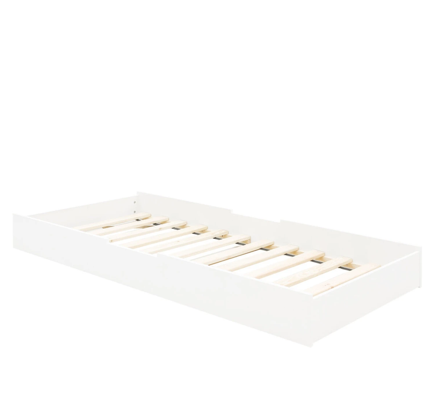 Aparte bedlade 90 x 200 cm voor het tienerbed Camille, Corsica, Elena, Evi, Lucca en Narbonne. Ideaal voor extra opbergruimte onder het bed, of als extra slaapplaats als er een vriendje/vriendinnetje komt logeren. De lade wordt geleverd inclusief bodemplaten en houten lattenbodem. Exclusief matras (90 x 195 cm).