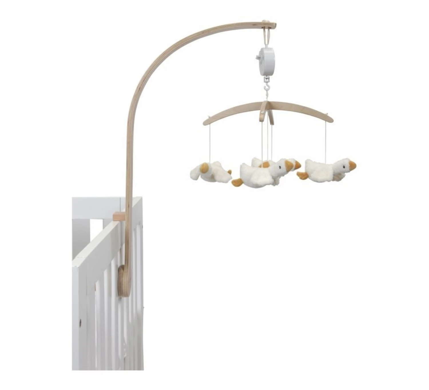 Deze mooie houten Little Goose muziekmobiel werkt rustgevend voor baby’s dankzij het lieve slaapliedje. Aan de mobiel hangen vijf gansjes die het heerlijk vinden om rondjes te vliegen om je baby te vermaken. Baby’s kijken graag naar de beweging van deze speeltjes, wat hun visuele ontwikkeling stimuleert. De muziekmobiel is geschikt vanaf de geboorte en eenvoudig te bevestigen aan het kinderbed of de box. Leuk te combineren met andere items uit de Little Goose collectie zoals een knuffel. WAARSCHUWING: Bevestig dit speelgoed buiten bereik van het kind. Om te voorkomen dat het kind verstrikt raakt, en zich bezeert, verwijder dit speelgoed wanneer het kind op handen en voeten begint te kruipen. Te monteren door een volwassene.
