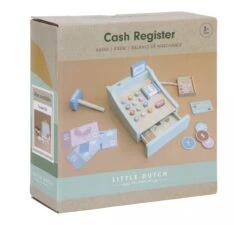 Laten we winkeltje spelen! Stel je voor dat je je eigen winkeltje hebt. Scan de producten, druk op de knopjes en bereken het totaal. Wilt u contant of met pin betalen? Deze houten kassa heeft zowel een pinautomaat als munten en bankbiljetten die je in de kassalade kunt opbergen. Alles wat je nodig hebt om winkeltje te spelen met je mama en papa, vrienden of favoriete pop.