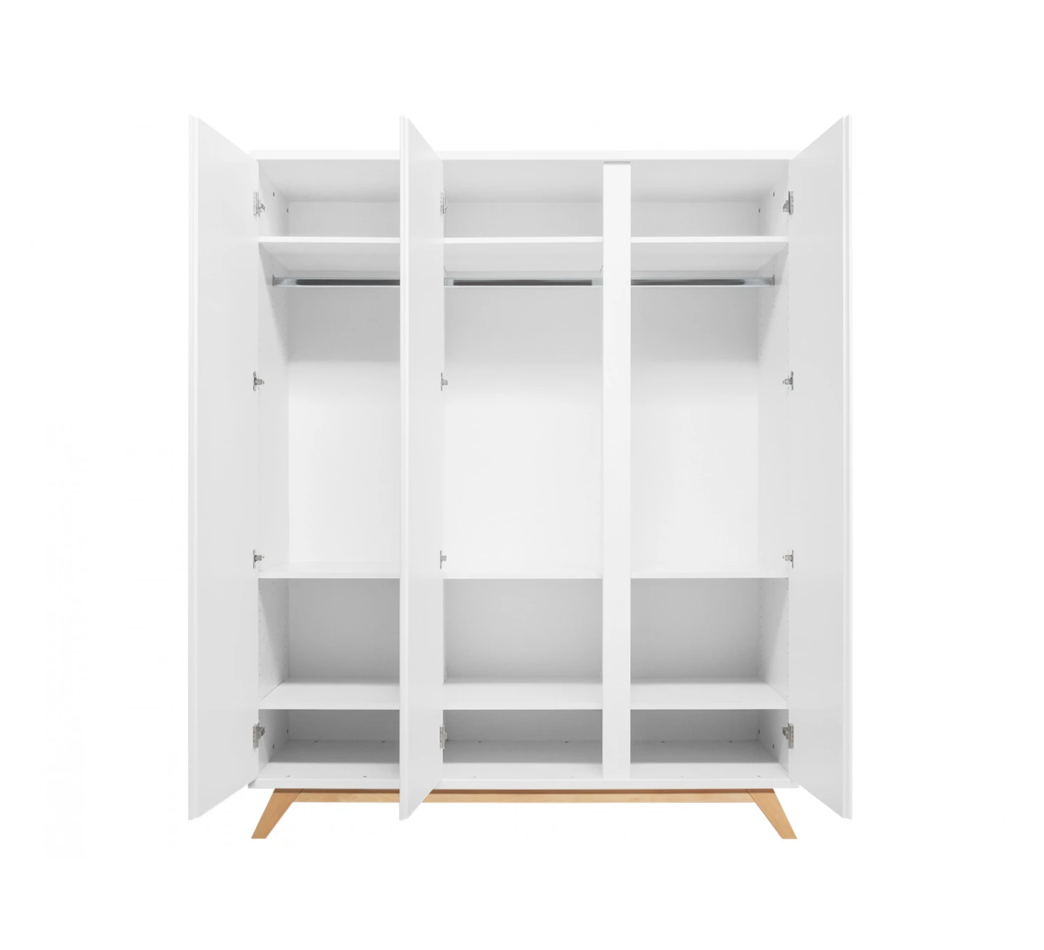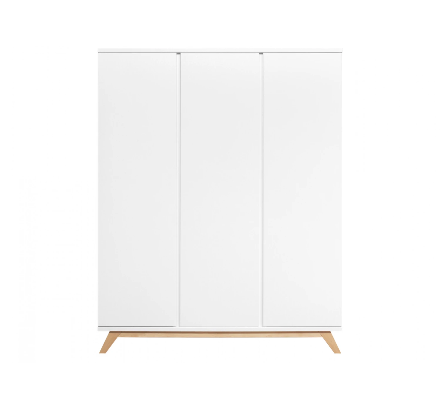 De Lynn 3-deurskast van Bopita is een grote kledingkast met 3 deuren in de combinatie van witgelakt hout met blanke houten schuine poten. De kast heeft een strakke uitstraling door de greeploze, gladde deuren. Indeling per deur: bovenin een plank, een roede en onderin twee legplanken die in hoogte verstelbaar zijn. Deze kast is geschikt voor zowel een babykamer als een tienerkamer.