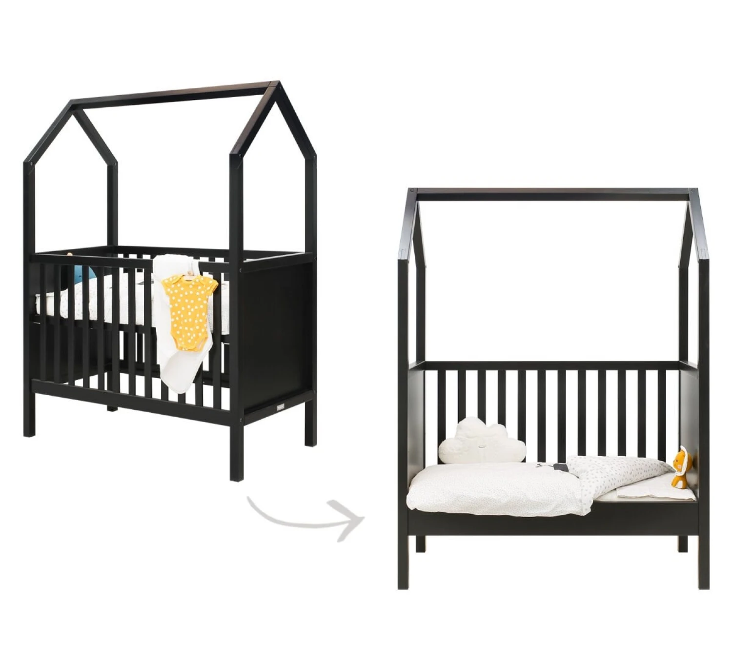 My First House Bedbank 60×120 is een ombouwbaar bed met een dakframe. De bedbodem is in hoogte verstelbaar. Van een spijlenbed naar een bedbank ombouwbaar. Zo heb je extra lang plezier van dit bed! De matrasmaat blijft na ombouwen hetzelfde.