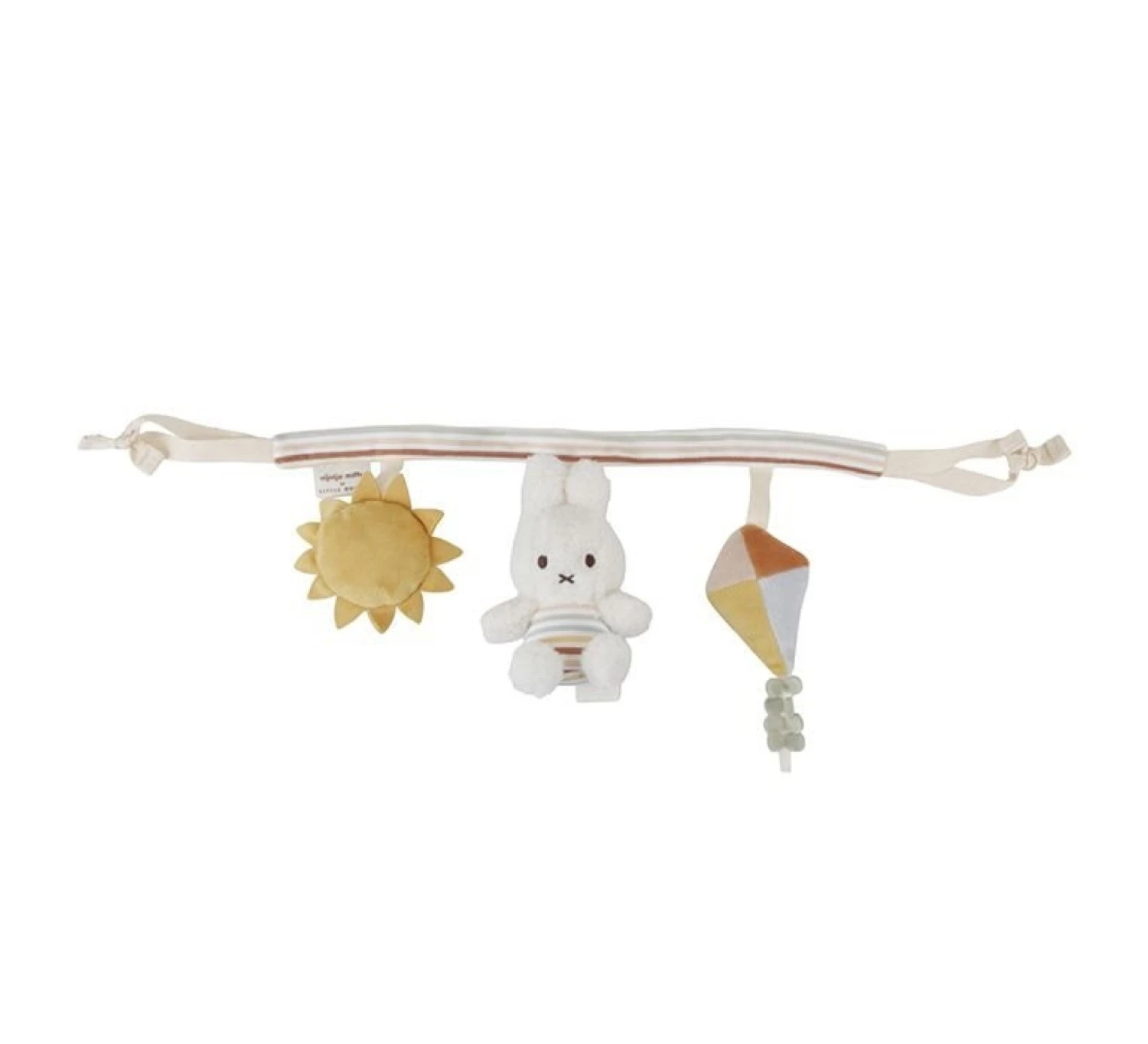 Probeer nijntje maar te pakken! Deze wagenspanner is niet alleen mooi om naar te kijken als je onderweg bent, hij nodigt ook uit om te spelen. Nijntje en de vlieger en zon uit de Vintage Sunny Stripes-collectie van Little Dutch hebben elk een functie om te ontdekken. Vind het ratelende geluid, het piepen en knisperen! Bevestig de wagenspanner gemakkelijk aan het autostoeltje of de kinderwagen en je kleintje zal zich vermaken als jullie onderweg zijn. Ook goed voor de hand-oogcoördinatie! De wagenspanner is wasbaar in de wasmachine op 30°.