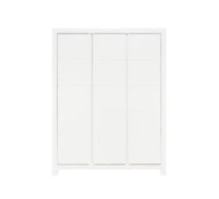 Moderne 3-deurskast van de serie Thijn. De deuren zijn greeploos uitgevoerd en zijn voorzien van subtiele horizontale groeven. Het interieur bestaat uit drie vaste schappen, drie hangroedes en 3 in hoogte verstelbare legplanken.