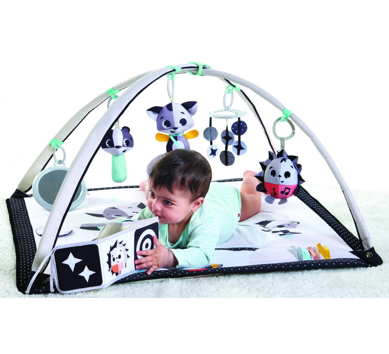 Speel en leer in stijl. De Magical Tales™ Black & White Gym is een feest voor zowel jouw als je baby’s ogen! De contrasterende zwarte en witte kleuren stimuleren het zicht van je baby en inspireren om te verkennen, te leren en te groeien. De verstelbare bogen passen zich aan je opgroeiende babytje aan, zodat hij of zij nog lang van de leuke activiteiten kan genieten. Ondertussen ontwikkelt je baby hiermee belangrijke vaardigheden zoals verbeeldingskracht, auditieve kennis, fysieke ontwikkeling en nog veel meer. De Magical Tales™ Black & White Gym bevat 18 verschillende ontwikkelingsactiviteiten die je kindje volop zullen vermaken. Het zachte opvouwbare boekje is inbegrepen bij de speelmat. Ook bevat de Gym leuke muziek en bijtspeeltjes. Het kleed is wasbaar in de wasmachine.